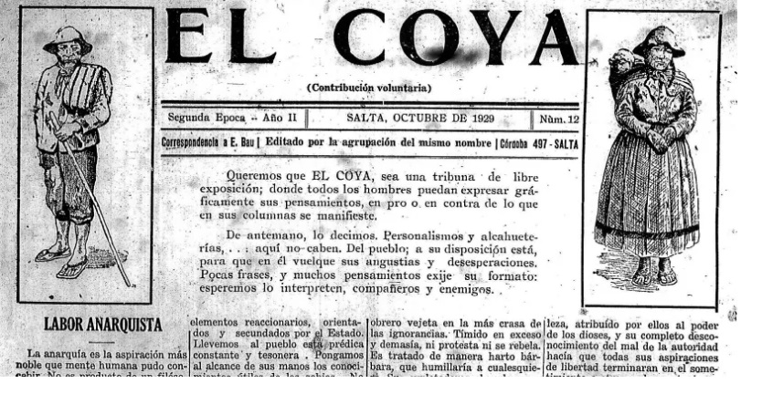 Este silenciamiento del que habla Mariano quizás pueda entenderse a través de este dato expuesto en el trabajo de investigación de Edgardo Daniel Diz, titulado “Sobre el anarquismo en Salta: Una aproximación a El Coya (1924-1932) Periódico de los gremios Autónomos”. Allí detalla que no existe constancia acerca de esta publicación en las principales bibliotecas públicas o privadas de Salta ni tampoco en el acervo de algunos sindicatos salteños consultados o en bibliotecas personales como la del anarquista salteño Juan Farfan.