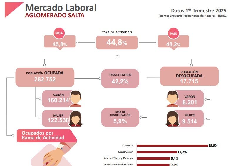 El informe de la Dirección General de Estadísticas y Censo de la provincia de Salta “Mercado de Trabajo. Resultados Primer Trimestre 2025” elaborado por el equipo de trabajo del Departamento Económico de la Dirección en base a análisis de los micro datos de la base de usuarios y hogares pertenecientes a la Encuesta Permanente de Hogares (EPH) del Instituto Nacional de Estadísticas y Censos de la República Argentina (INDEC), indica una tasa de empleo alrededor del 42,2% en el Aglomerado Salta mientras que la tasa de actividad fue del 44,8%.